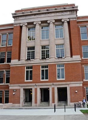 The brick and concrete Washington High School building features classical architectural elements with large windows and decorative stonework throughout its structure.