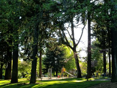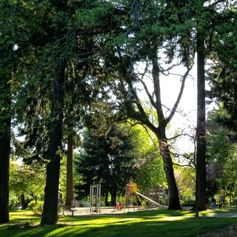Oregon Park extends across several acres with grassy fields, paved pathways, and modern playground equipment designed for children of different ages.