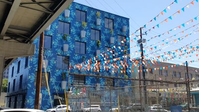 The Tree Farm spans six stories with a bright blue facade adorned by 56 strawberry trees suspended in steel planters across its exterior walls.