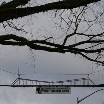 The Nutty Narrows Bridge is a crossing made of aluminum and fire hose that spans across Olympia Way between a park and a library. The structure provides a dedicated passage for squirrels and other small animals to cross safely.