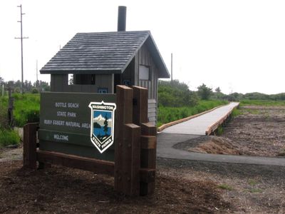 Bottle Beach State Park spans 64 acres with 6,000 feet of shoreline along Grays Harbor, featuring extensive tide flats and wildlife viewing platforms.