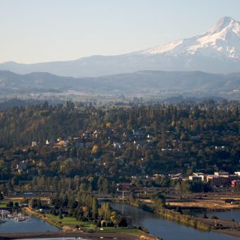 Hood River is a small city at the junction of the Hood River and Columbia River in Oregon. It sits about 60 miles (96 kilometers) east of Portland between forested slopes on one side and the wide riverbed on the other.