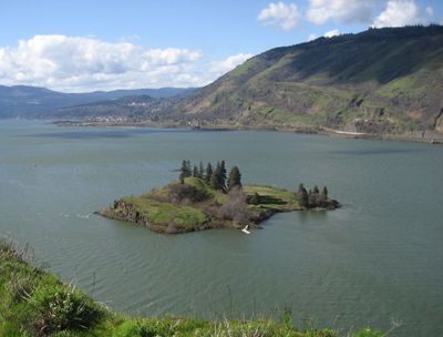 Eighteenmile Island sits in the Columbia River between Mosier and Hood River, covering roughly 10 acres with pine and willow trees along basalt rock formations. A sandy beach borders the island, and a single house from the late 1960s occupies the property.