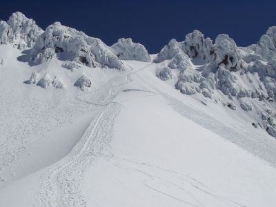 Coalman Glacier extends across the southern face of Mount Hood, spanning from 11,200 to 10,500 feet in elevation near the volcanic crater rim.