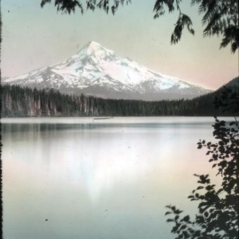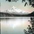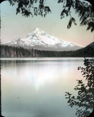 The lake features a viewing point where Mount Hood's reflection creates a mirror image on the water surface during calm morning conditions.
