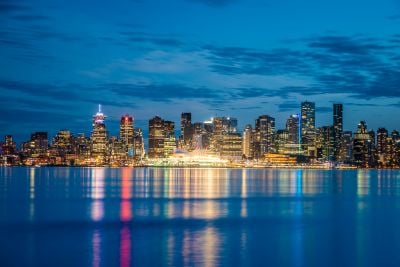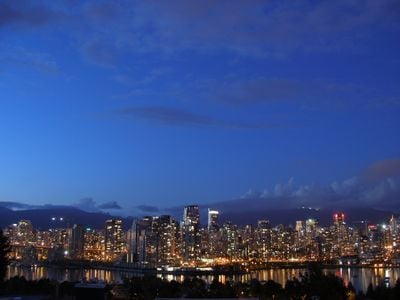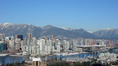 Vancouver extends between the Coast Mountains and Pacific Ocean, with its glass towers reflecting the waters of English Bay and Burrard Inlet.