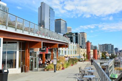 Local businesses including a brewery, fish cannery, and chocolatier operate in the MarketFront, connecting to Pike Place Market through a pedestrian bridge.