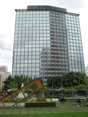 The 23-story structure features large windows across its modernist facade, incorporating extensive glass panels that maximize natural light throughout the building.
