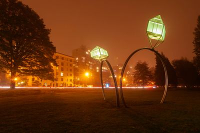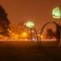 The rings incorporate LED lights that illuminate the structure during evening hours, creating reflections on the water surface of English Bay.