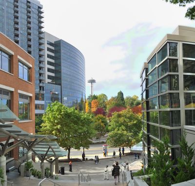 The Denny Regrade stretches north of downtown Seattle from Stewart Street to Mercer Street, combining residential buildings with commercial establishments.