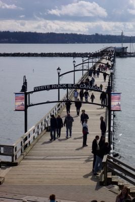 The wooden pier stretches 470 meters into Semiahmoo Bay, featuring a breakwater at its southern end and offering views of coastal mountains.