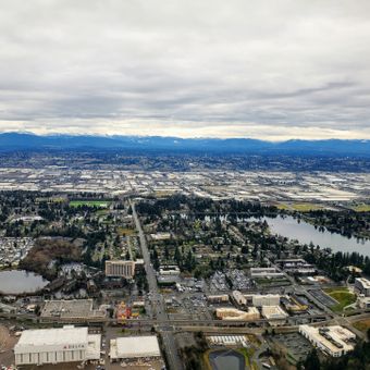 SeaTac is a city in King County, Washington, built around the Seattle-Tacoma International Airport and positioned between the two larger urban centers. Business buildings, hotels and retail strips line wide boulevards near the runways, which dominate much of the developed area.