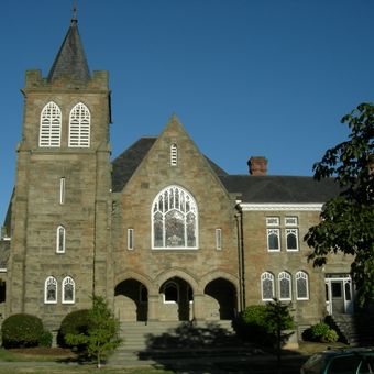 The First Methodist Protestant Church stands at 128 16th Avenue East, featuring a combination of Colonial Revival and Gothic Revival architectural elements.
