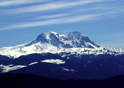 The mountain offers multiple climbing routes from Alice Ridge, Brohm Ridge, and Diamond Head parking lot, requiring technical skills due to icy conditions and crevasses.