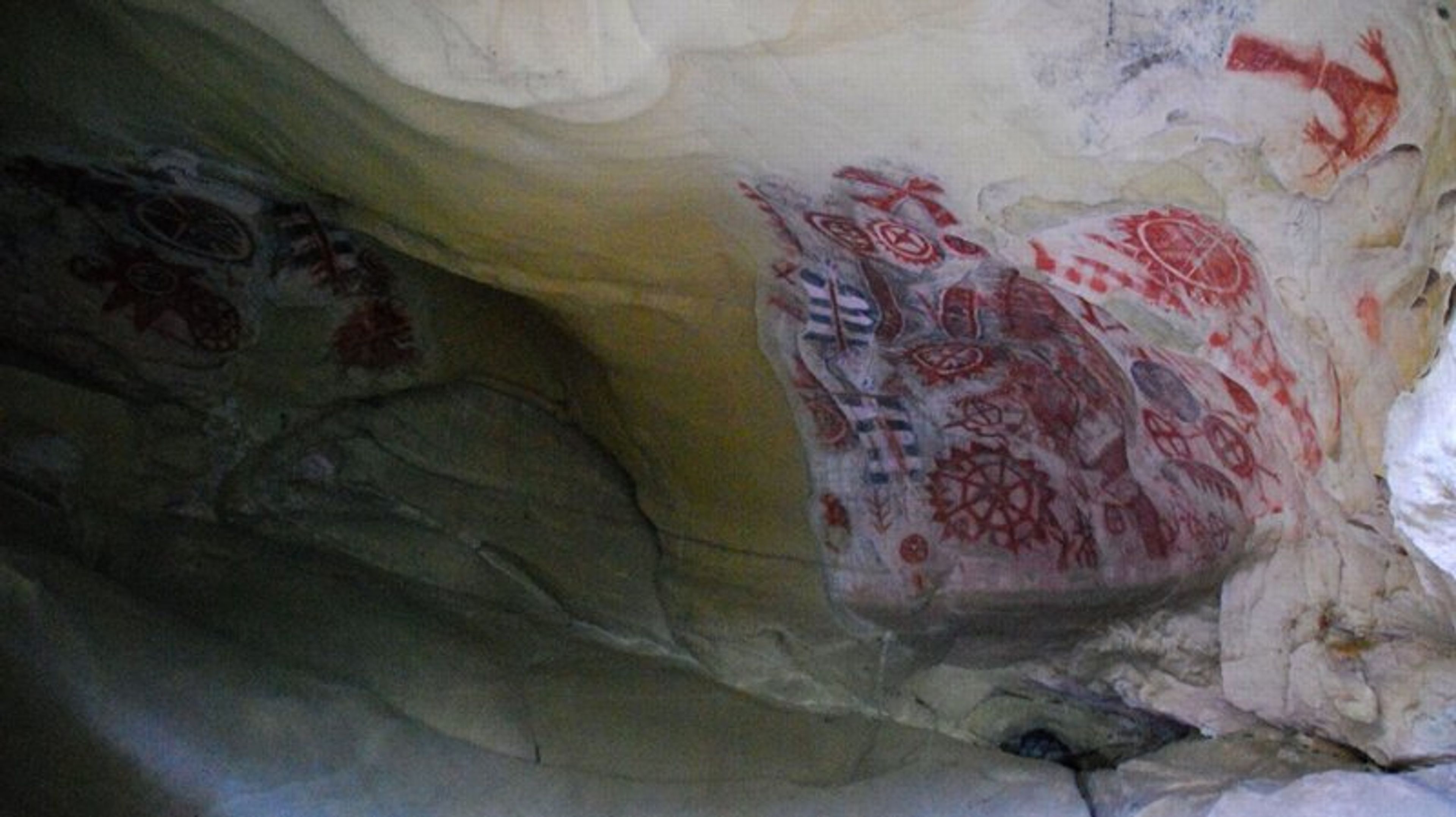 The cave paintings represent elements of Chumash cosmology, documenting the spiritual and daily experiences of these Native American people.