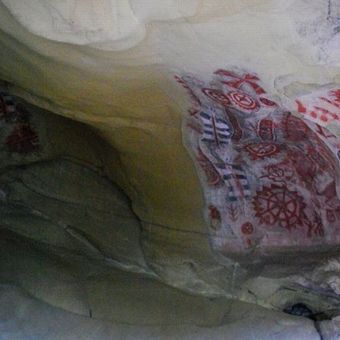 The protected sandstone cave contains ancient paintings created with mineral pigments on its irregular walls and shallow ceiling surfaces.