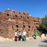 The three-story sandstone building features traditional Pueblo-style architecture with small windows, stepped roofs, and interior wooden beams covered in mud.