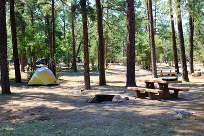 Mather Campground contains 327 individual sites spread among Ponderosa pines, each featuring a fire ring, cooking grate, and picnic table at 7,000 feet elevation.