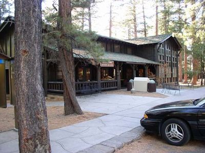 The Grand Canyon Inn and Campground features rustic wooden architecture that integrates with the natural surroundings of the Arizona landscape.