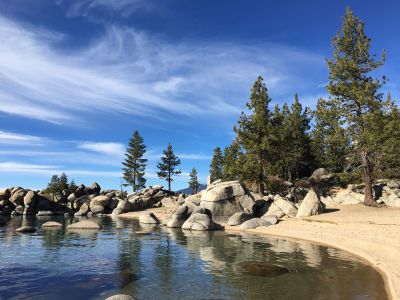 The sandy beach stretches along the eastern shore of Lake Tahoe, featuring large granite boulders and clear water against the mountain background.