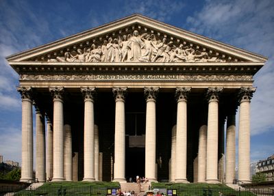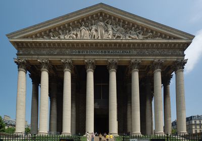 La Madeleine presents a Neoclassical design with 52 Corinthian columns surrounding the exterior, reaching a height of 20 meters each point.