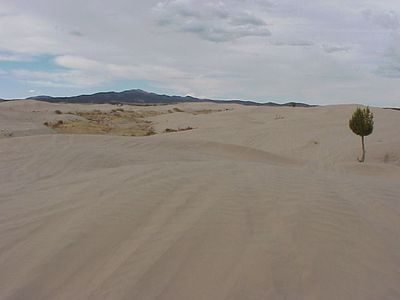 The sand deposits formed long ago when an ancient lake left behind these materials. Over thousands of years, wind has shaped the sand into the dune system visible today.