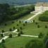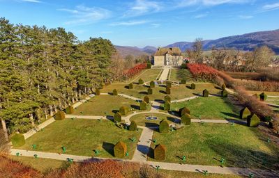 The castle features a symmetrical facade with central protruding sections, decorated rooms on the ground floor, and dual-level gardens with trimmed yews.