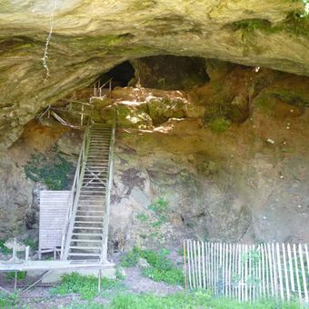 The cave opens into a limestone cliff above the Tardoire River, featuring a 13-meter wide and 10-meter high entrance portal.