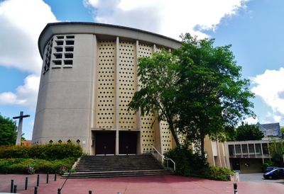 Architect Henry Bernard designed the church during his captivity in Germany, focusing on bringing priests closer to their congregation through innovative spatial arrangements.