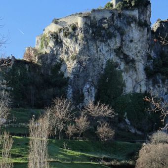 The castle stands on a rocky summit above the village, featuring defensive walls and structures adapted to the challenging mountainous terrain.