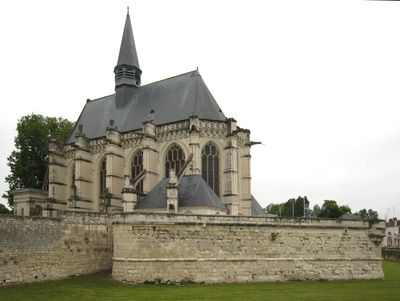 The chapel represents French medieval religious architecture through its vaulted ceiling, five-sided apse, and elaborate stone carvings throughout the structure.