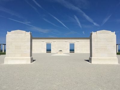 The British Normandy Memorial features stone columns engraved with the names of 22,442 service members who died during the Battle of Normandy in 1944.