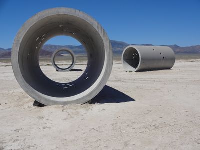 Four concrete cylindrical tunnels form an X pattern in the Great Basin Desert, measuring 86 feet diagonally with holes representing constellation patterns.