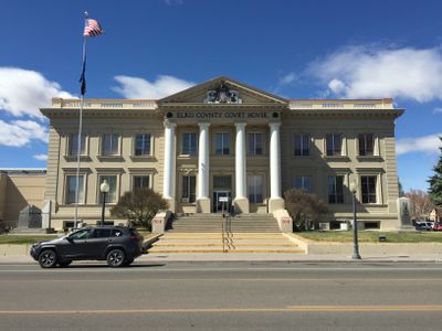 The Elko County Courthouse features a symmetrical design with a central entrance, balanced windows, and stone construction at 571 Idaho Street.