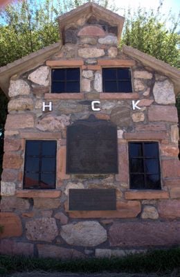 The Heber C. Kimball Gristmill features a rock foundation and solid adobe walls decorated with red sandstone elements at the corner of Orchard Drive.