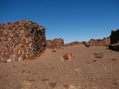 The eight-room pueblo structure incorporates large segments of petrified wood set in clay mortar, forming walls that rise five feet in height.