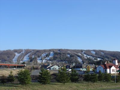The mountain features 40 trails spread across 142 acres of skiable terrain, with a vertical drop of 213 meters and an elevation of 416 meters.