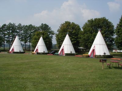 Each tepee unit includes a bathroom, television, air conditioning, and parking space, with rates starting at ninety-nine dollars per night.