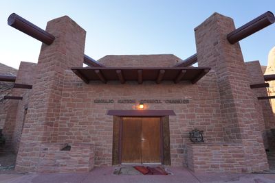 The Navajo Nation Council Chamber features red sandstone walls and an octagonal shape that mirrors the traditional hogan structure of Navajo dwellings.