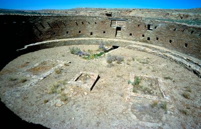 Casa Rinconada contains a circular kiva measuring 64 feet in diameter, featuring 34 wall niches, masonry firebox, and inner bench for ceremonies.