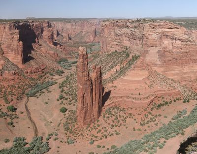 Spider Rock stands as an 830-foot sandstone formation rising from the canyon floor at the intersection of Canyon de Chelly and Monument Canyon.