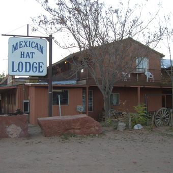 Mexican Hat is a small community in the Colorado Plateau high desert that sits along the San Juan River, surrounded by russet-colored rock formations. The setting features expansive arid landscapes with dramatic stone structures and wide open views that echo the approach to Monument Valley.