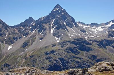 The mountain contains a specific geological formation that marks the transition between the Engadin valley and Val Bever, creating distinct climbing conditions.