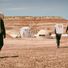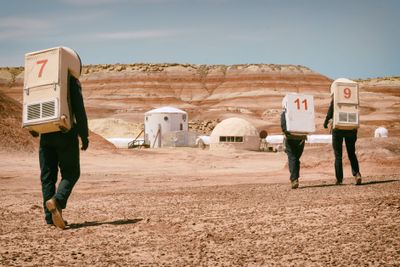 Teams of six scientists, engineers, and media professionals work together in simulated Mars conditions, wearing space suits during outdoor activities.