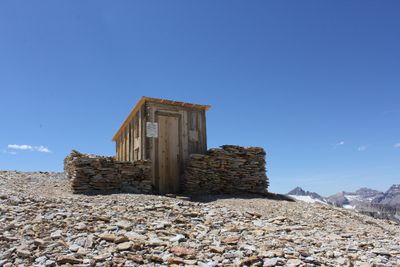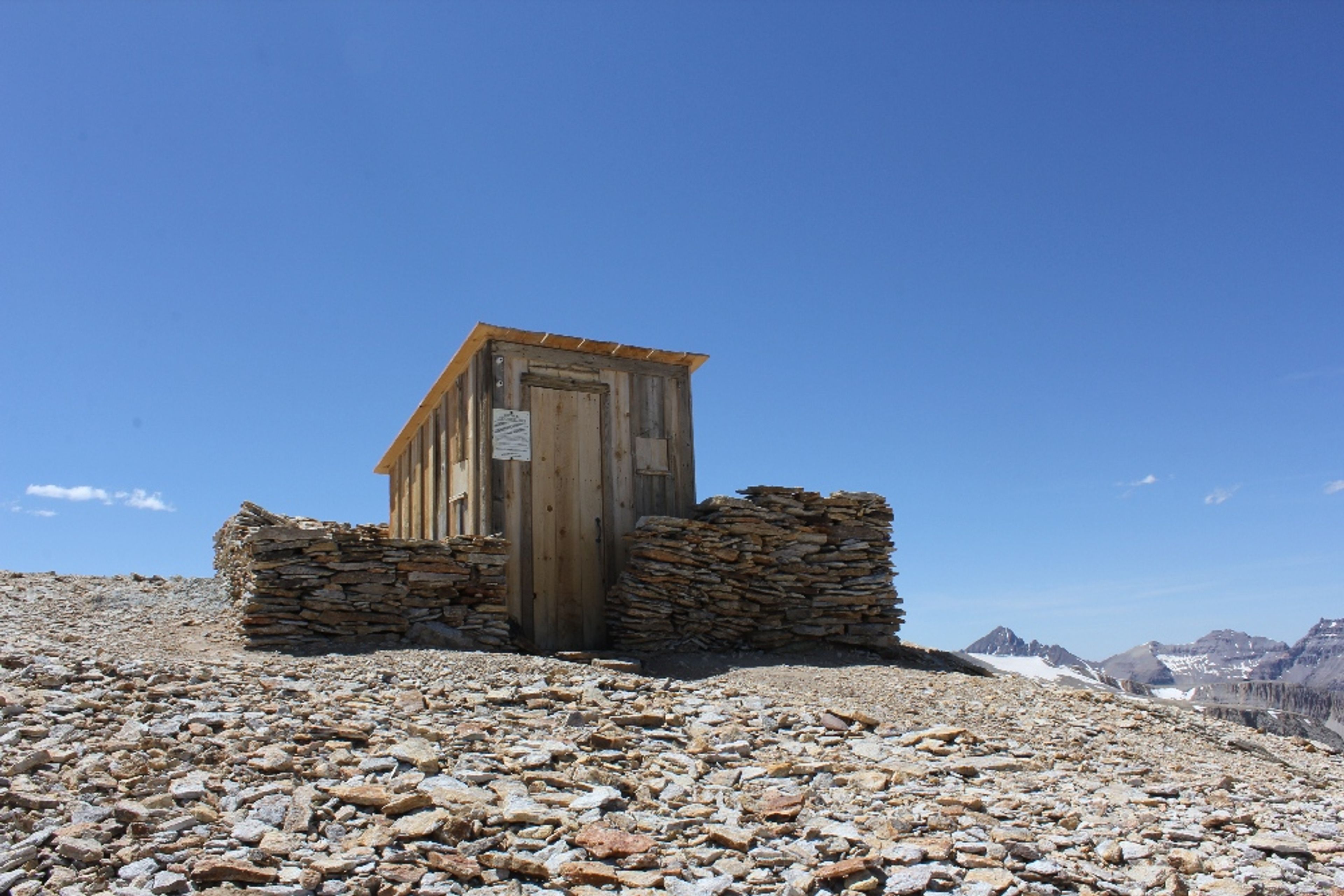Fort Peabody stands at 13,365 feet elevation on the border between Ouray and San Miguel Counties, featuring remains of a wooden structure with stone walls.