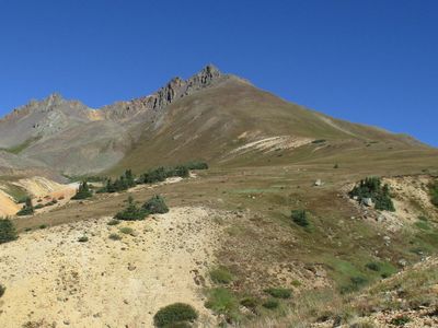Matterhorn Peak rises 13,590 feet above sea level, featuring grassy southern slopes that lead toward a distinctive rocky summit in the San Juan Range.