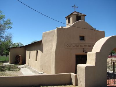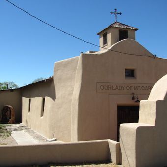 The Our Lady of Mt. Carmel Church features adobe walls, flat roofs, and rounded corners characteristic of Pueblo Revival architecture in New Mexico.