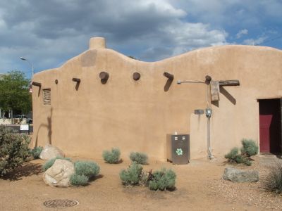 The structure reflects traditional Pueblo architectural elements through its curved walls, flat roof, and deep-set windows, representing Southwestern United States building heritage.