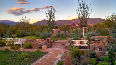 The Santa Fe Botanical Garden contains multiple sections featuring native plants, perennial borders, roses, lavender meadows, and drought-resistant gardens across its grounds.