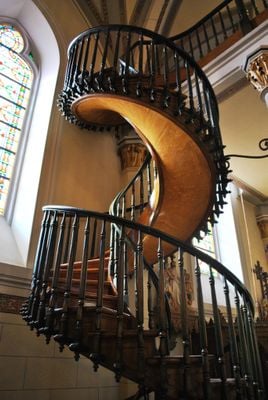 The Loretto staircase is a wooden spiral structure in a chapel located in Santa Fe that makes two complete rotations over roughly 20 feet in height. It contains 33 steps joined without a central support pole or nails, displaying an unusual construction method.